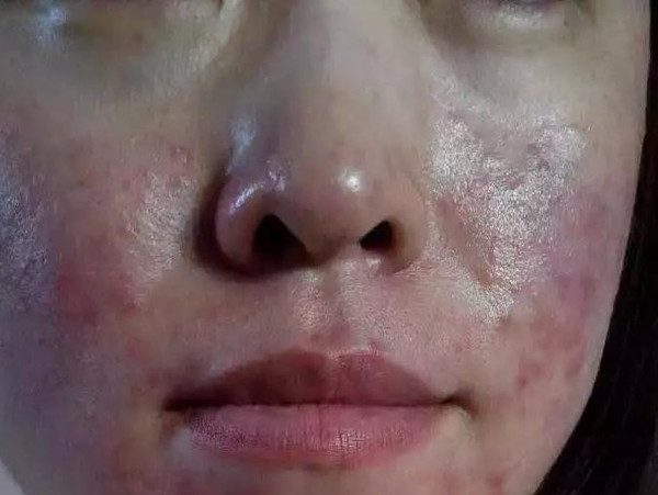 (圖片解析):這張圖片展示了激素臉患者皮膚變薄、紅血絲明顯的癥狀,長期使用激素導(dǎo)致皮膚屏障受損,使皮膚變得敏感脆弱。